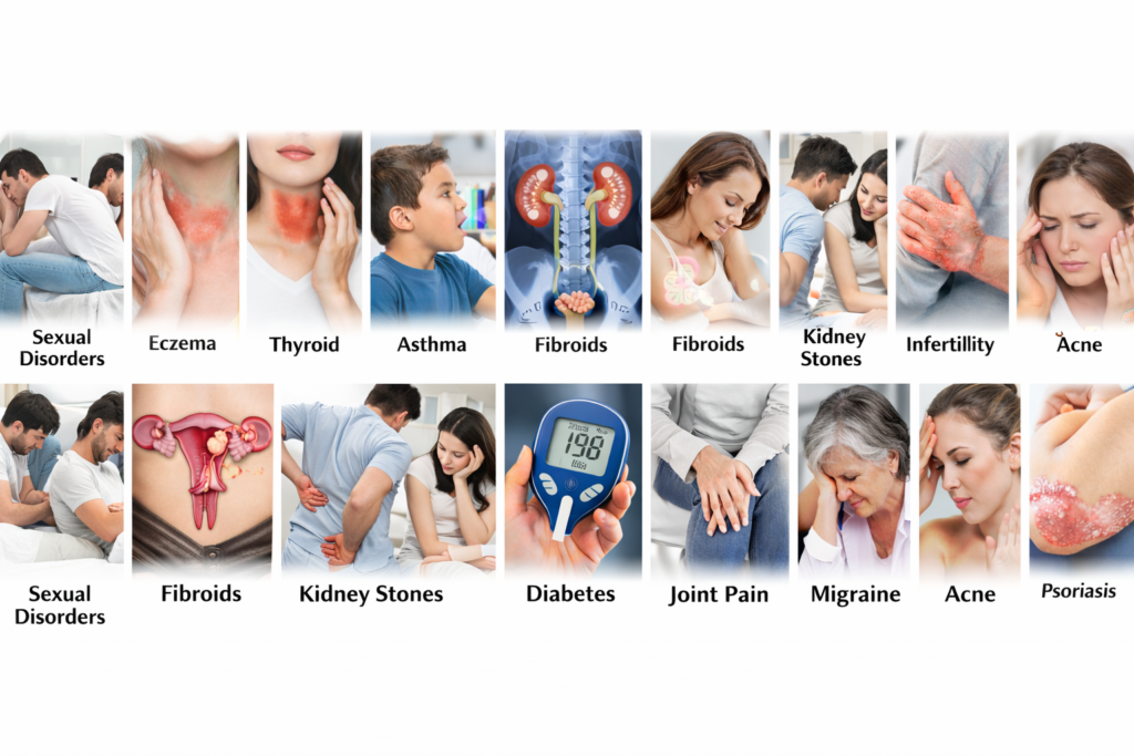 Specialized Treatments on Skin & Hair, Respiratory, Kidney, Musculoskeletal, Hormonal, Gastric, Lifestyle Disorders, Sexual Disorders, Nervous & Brain Disorders, Parkinson, Dementia, Vertigo, Psychiatric & Counselling women & children, IBS & cyst, Glandular swellings, Tumors & Cancers, All types of Fever, Acute Problems, Non-Infectious and Infectious (Covid-19) treatment.